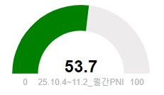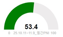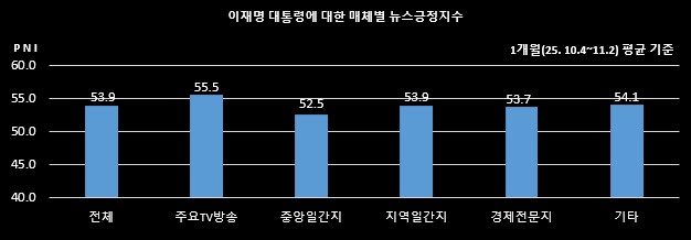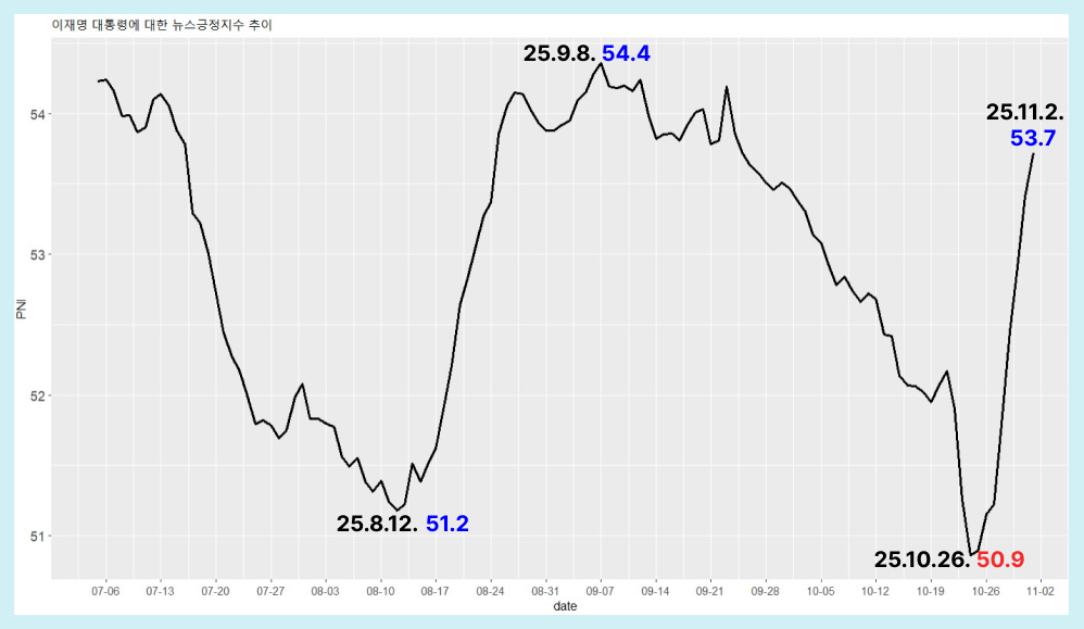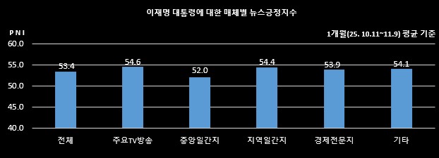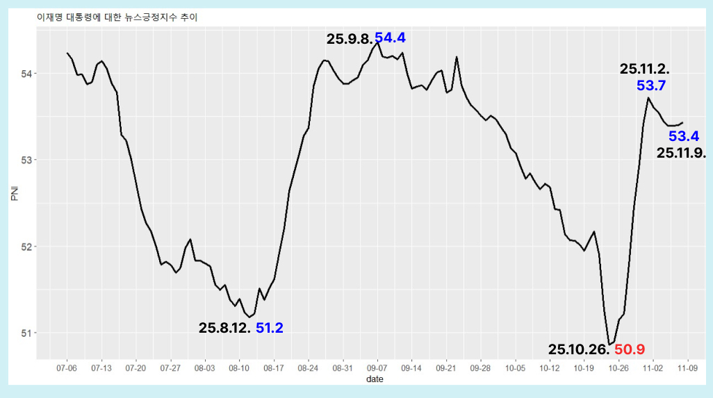 최근 1개월(25.10.11~11.9) 기준 이재명 대통령에 대한 월간 뉴스긍정지수(PNI)는 53.4