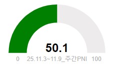 최근 1주일(25.11.3.~11.9) 기준 이재명 대통령에 대한 주간 뉴스긍정지수(PNI)는 50.1