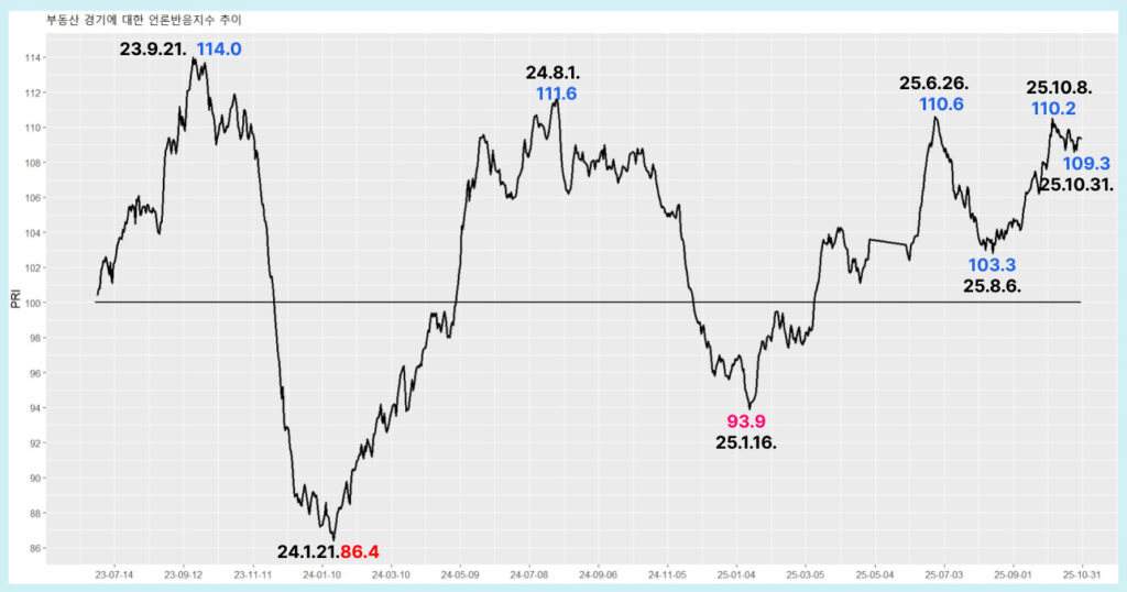 * 주요 결과 : PRI는 2025년 8월 초순부터 10월 초순까지 상승 추세를 보이다가, 10.15부동산 대책 이후 잠시 주춤하는 추세를 보이는 가운데, 10월 31일 현재 109.3을 기록