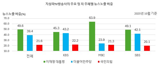 * 주요 결과 : 이재명 대통령에 대한 주요 지상파TV방송사의 2025년 10월 평균 뉴스 노출 비중은 49.6%로 지난 9월에 비해 2.6% 포인트 증가