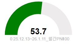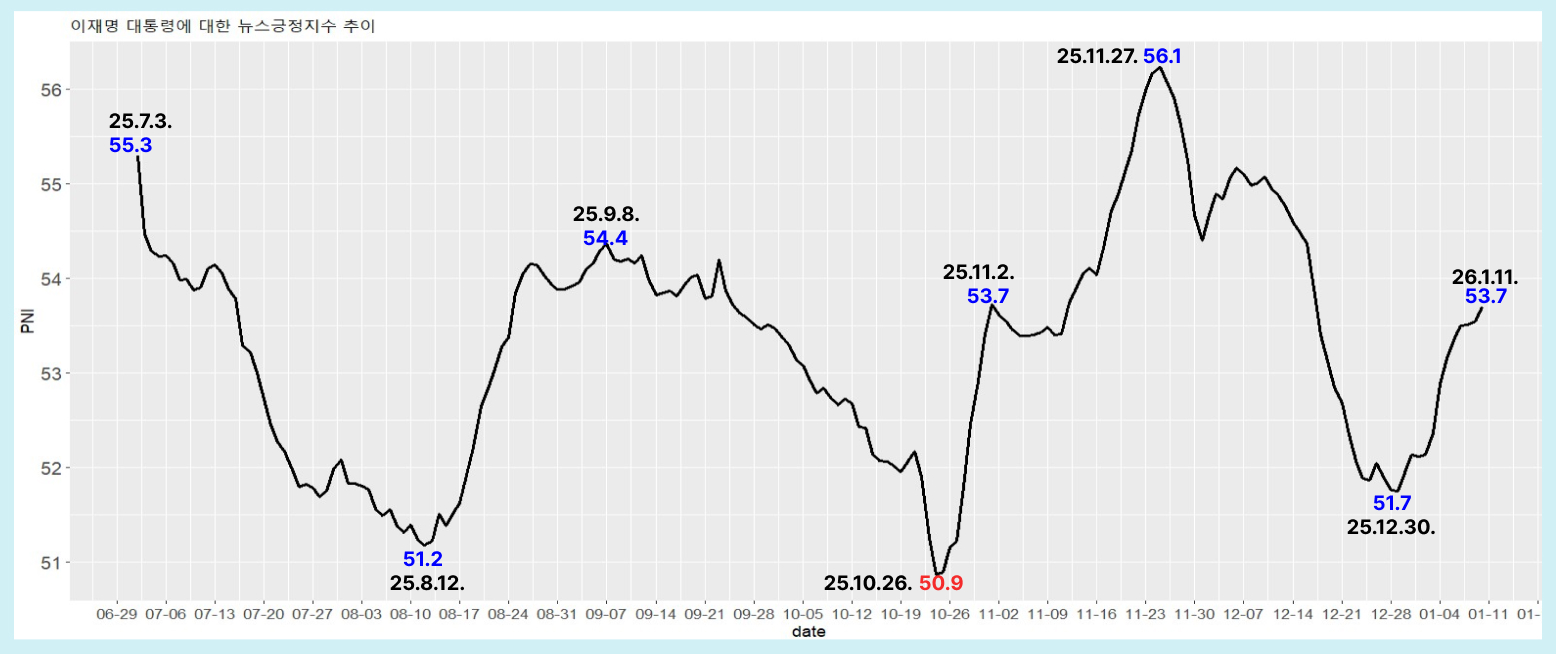 최근 1개월(25.12.13~26.1.11) 기준 이재명 대통령에 대한 월간 뉴스긍정지수(PNI)는 53.7