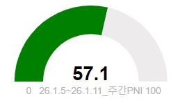 최근 1주일(26.1.5~26.1.11) 기준 이재명 대통령에 대한 주간 뉴스긍정지수(PNI)는 57.1