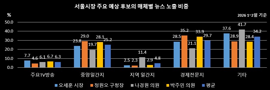 서울시장 주요 예상 후보의 매체별 뉴스 노출 비중